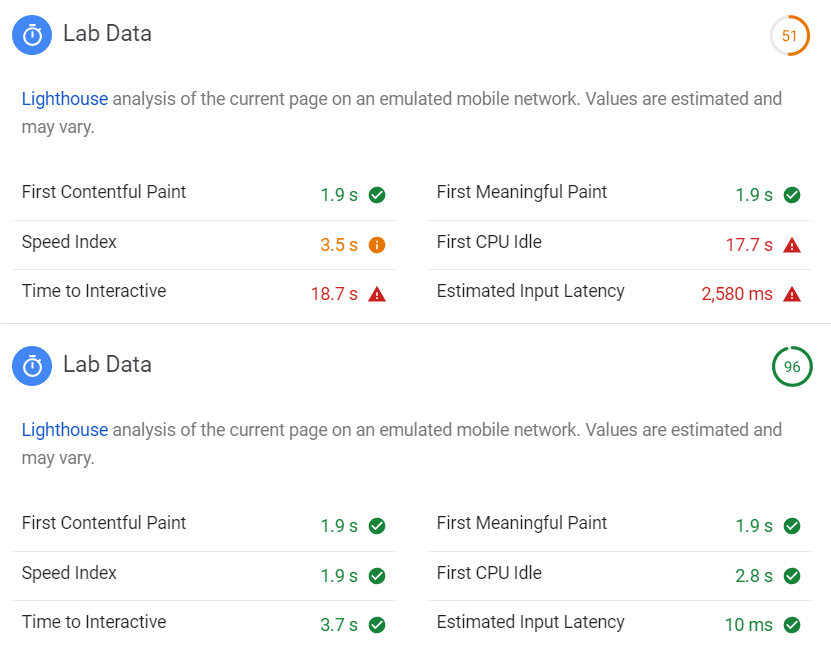 Na analyse bleek onder meer dat Hotjar een impact had van ongeveer 2 procentpunten op de PSI score. De chat had omwille van de benodigde laadtijd een invloed van maar liefst 38 procentpunten. Ook de code benodigd voor Google Tag Manager zelf en aanvullend Google Analytics, hebben hun invloed op de performance; het blijft immers externe JavaScript dat eerst gedownload en vervolgens uitgevoerd moet worden.