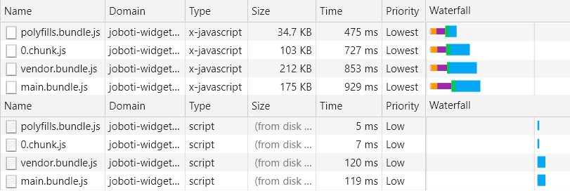 - Dit is ook terug te zien in de visualisatie in kolom "Waterfall", waarbij de blauwe balk de download-tijd representateert. Van een DNS lookup, Initial Connection & SSL (de andere kleuren-balken) is geen sprake meer van, waarmee we bijdragen aan het sneller inladen van de chat.